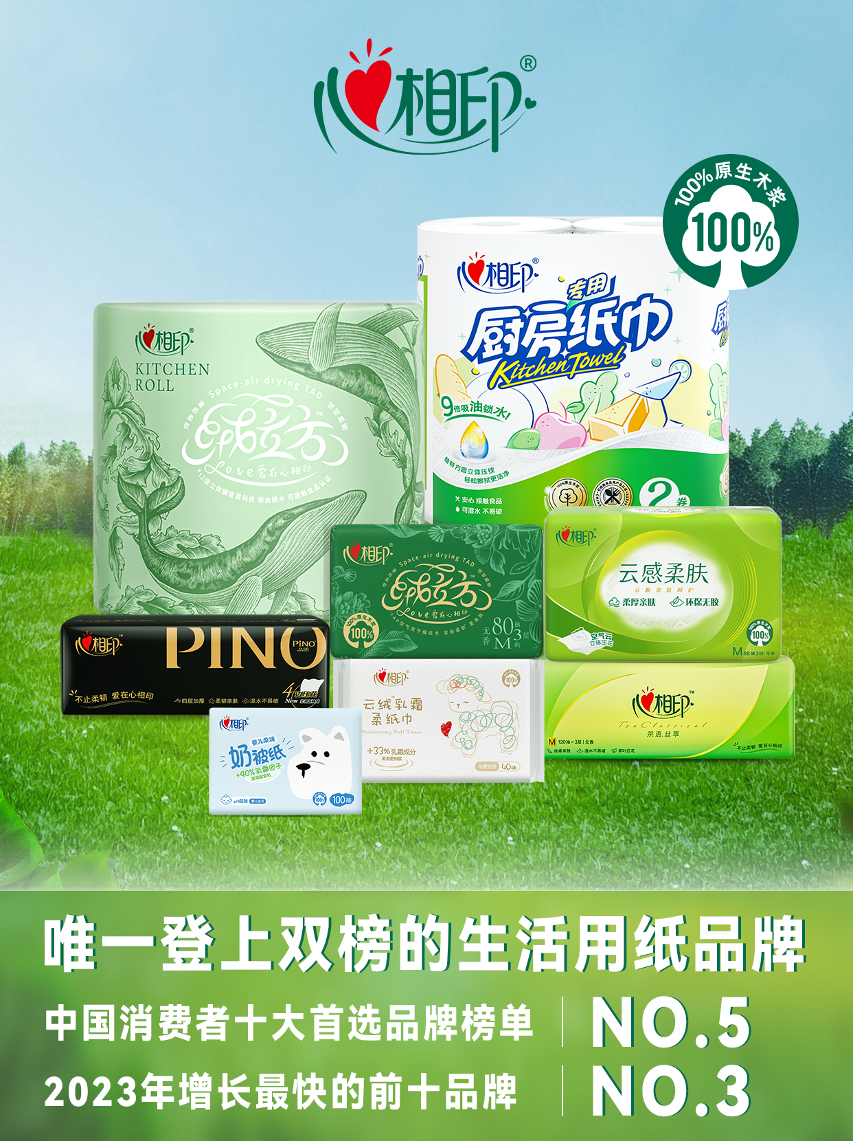 作为生活用纸行业国内第一品牌,心相印以“不止柔韧,爱在心相印”为传播口号对话消费者,始终秉持着“用心关爱身边每一个人”的品牌理念,以温馨、关爱为调性贴近消费者内心诉求,给予消费者温暖的守护和能量,位居“中国消费者十大首选品牌榜单”第五位。
